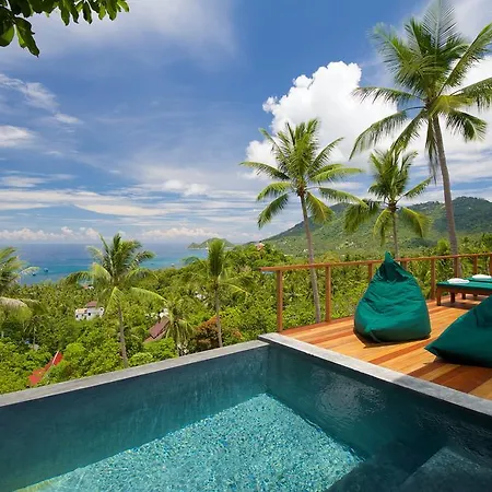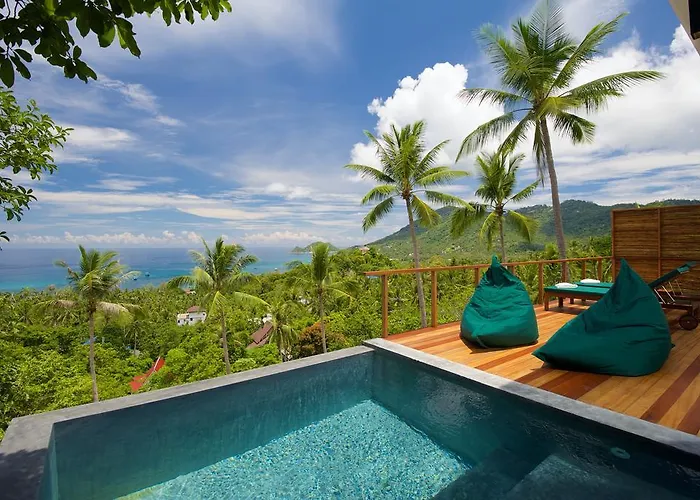 Die 8-Zimmer- Overthemoon Luxury Pool Villas Ko Tao zeichnet sich durch eine Lage, ungefähr 10 Gehminuten vom Strand (Haad Ao Mae), aus und überblickt das Meer. Die Villa bietet einen Infinity-Pool sowie Schnorcheln, Tauchen und Wandern für aktive Gäste.